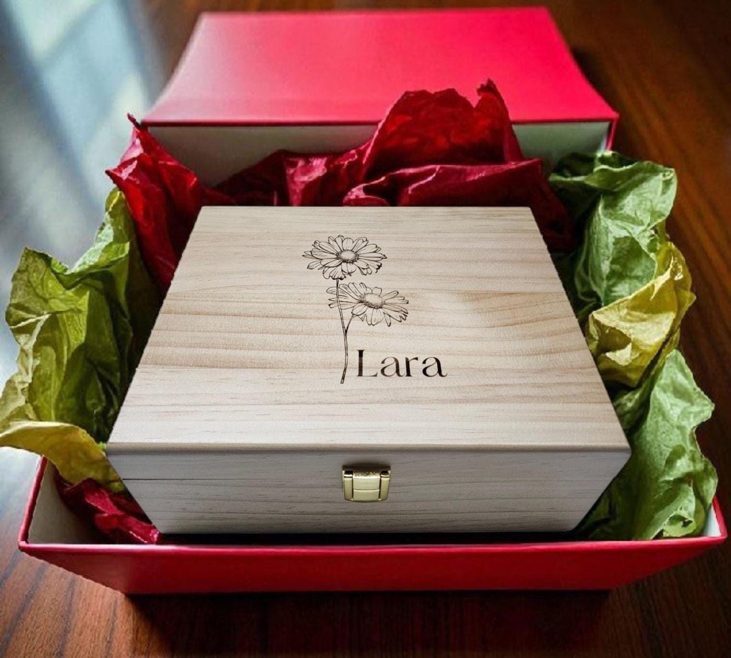 Personalized Birth Flower Keepsake Box – Wooden Memory Box | Pine or Bamboo (8x10x4)