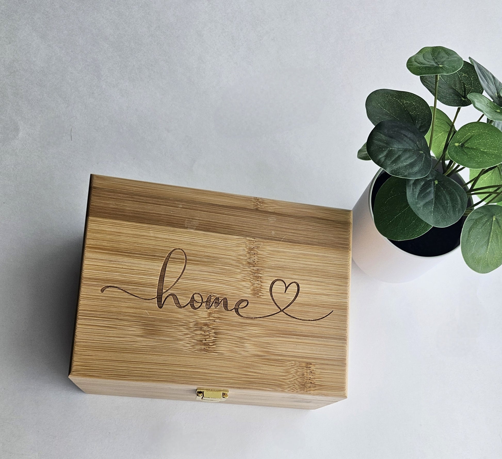 Engraved Bamboo Keepsake Box: Love, Home, Forever - Memory Box optional personalization