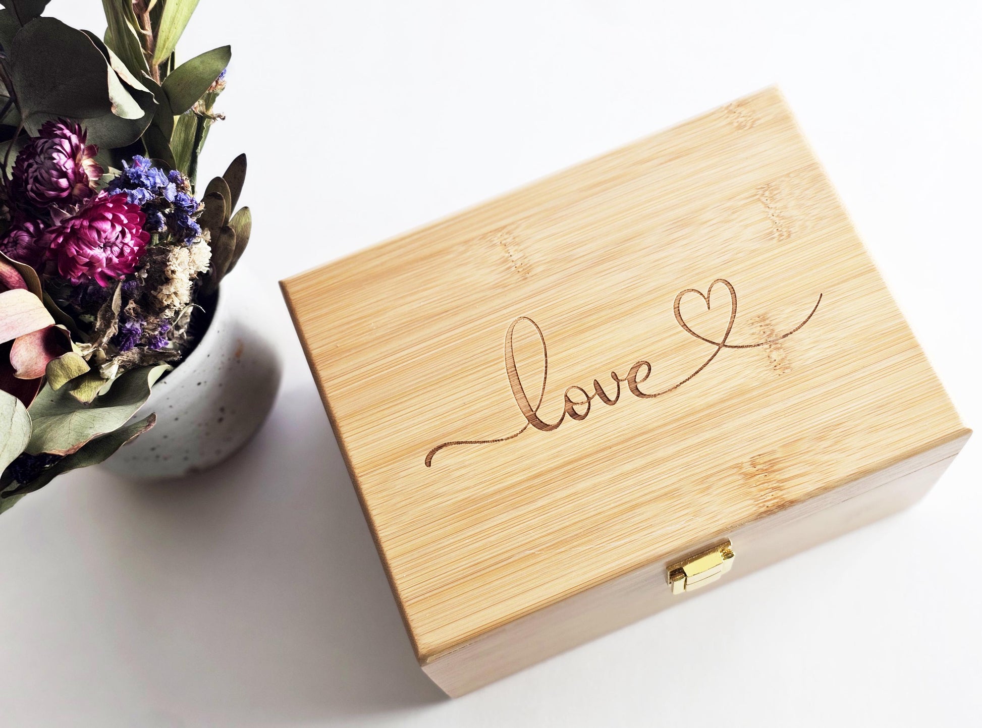 Our personalized bamboo keepsake boxes are the perfect way to store precious memories, jewelry, letters, or special treasures. Engraved with your choice of "love," "home," or "forever," each eco-friendly memory box offers a heartfelt and meaningful gift idea for weddings, anniversaries, housewarmings, or special occasions.