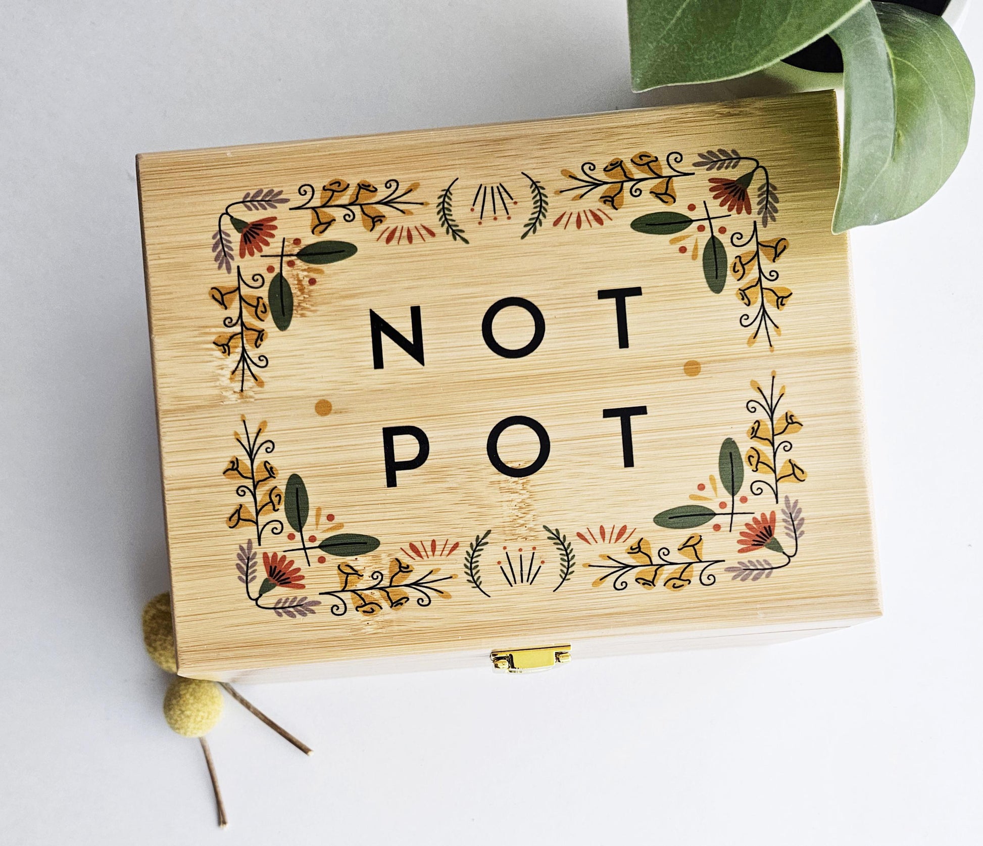Keep your essentials safe in this moderately sized bamboo stash box, featuring a playful “Not Pot” design. Whether used for herbs, jewelry, tarot decks, or keepsakes, this versatile box is perfect for both decorative display and discreet storage. Made from eco-friendly bamboo, it’s lightweight yet durable, with a secure clasp to keep everything in place. Customize it with personalized engraving inside the lid for a unique touch.