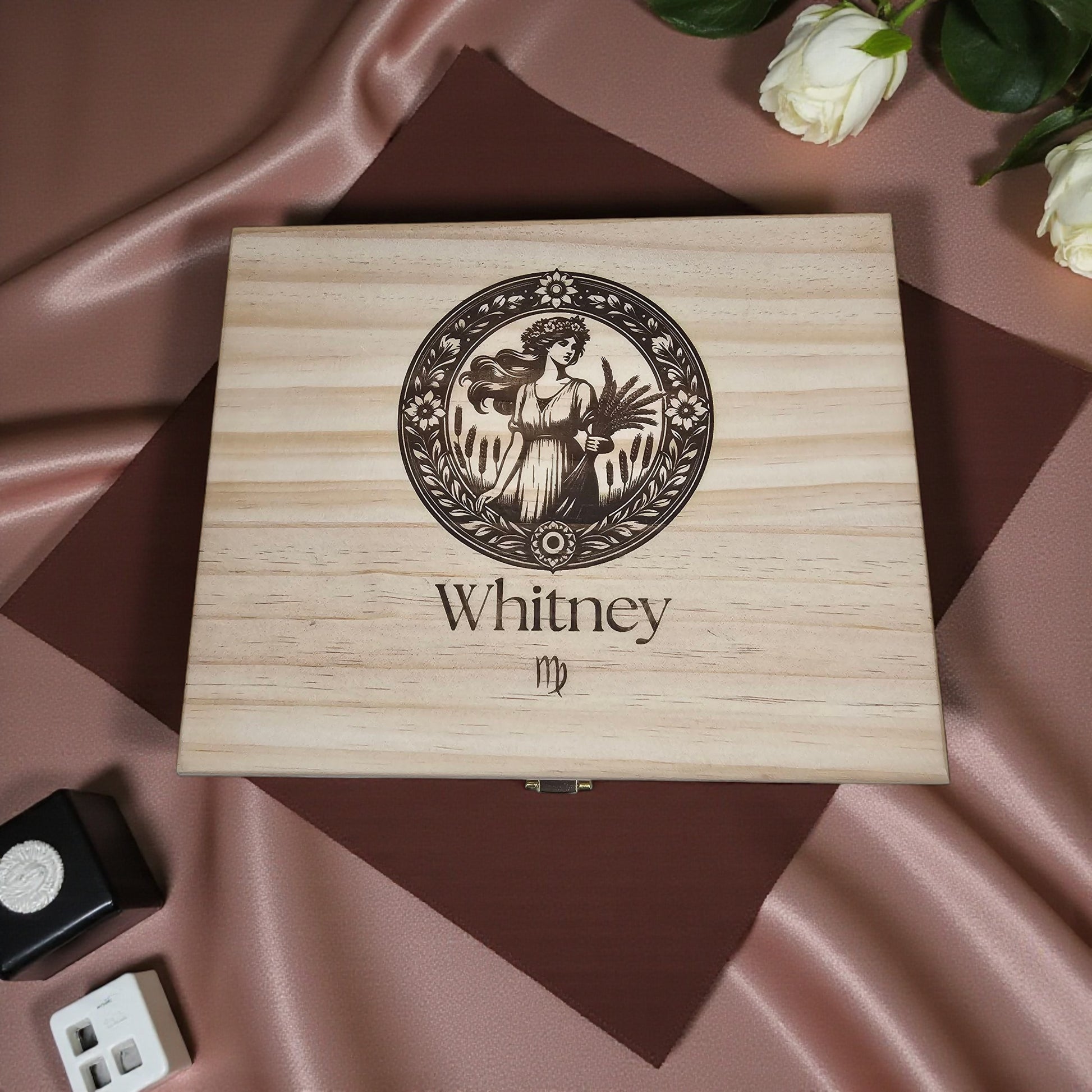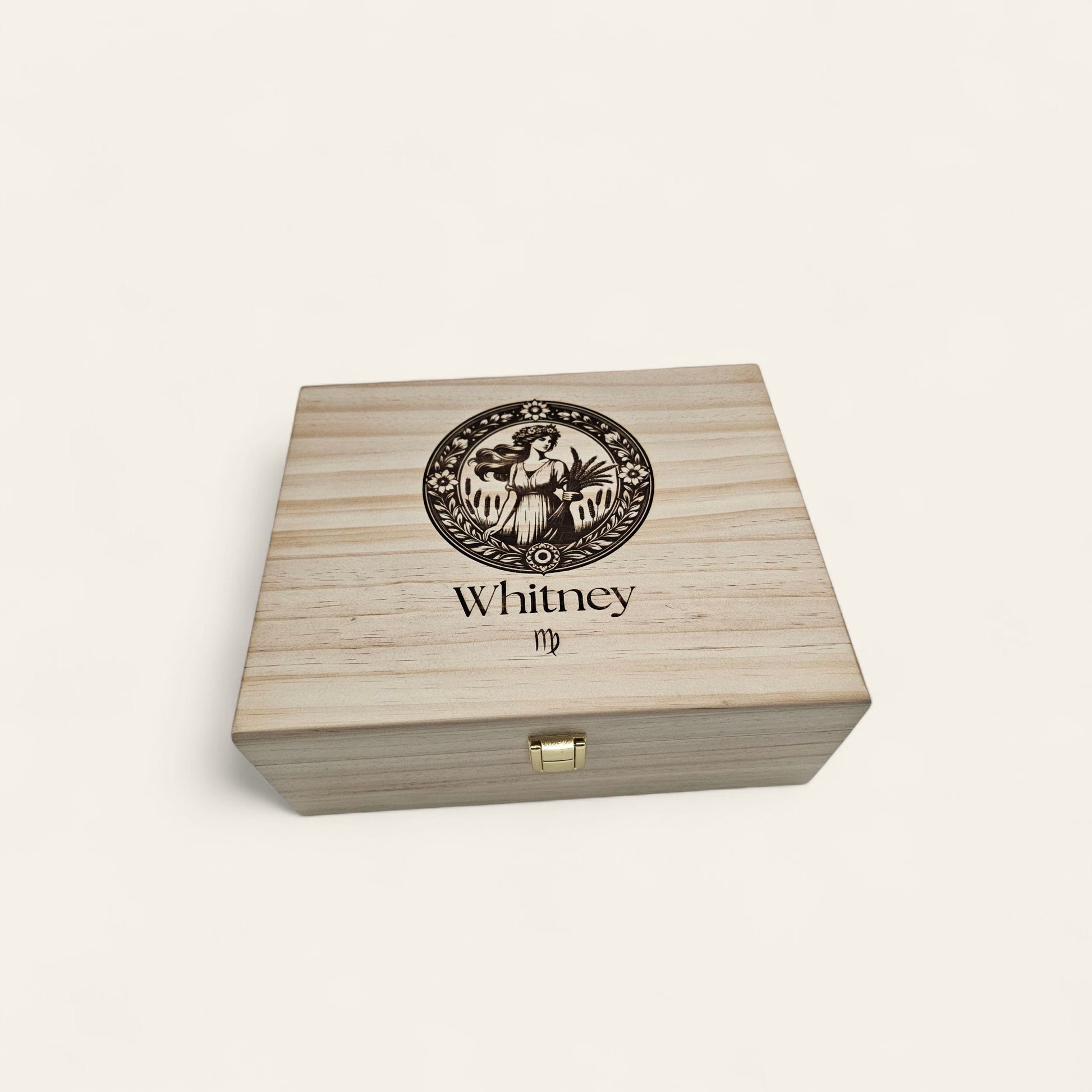 Crafted from natural pine or eco-friendly bamboo, each 8″ × 10″ × 4″ wooden memory box is customized with your star sign, name, date, or special phrase. Whether you’re a fiery Aries, dreamy Pisces, or grounded Capricorn, your astrology keepsake box becomes a reflection of your cosmic energy.